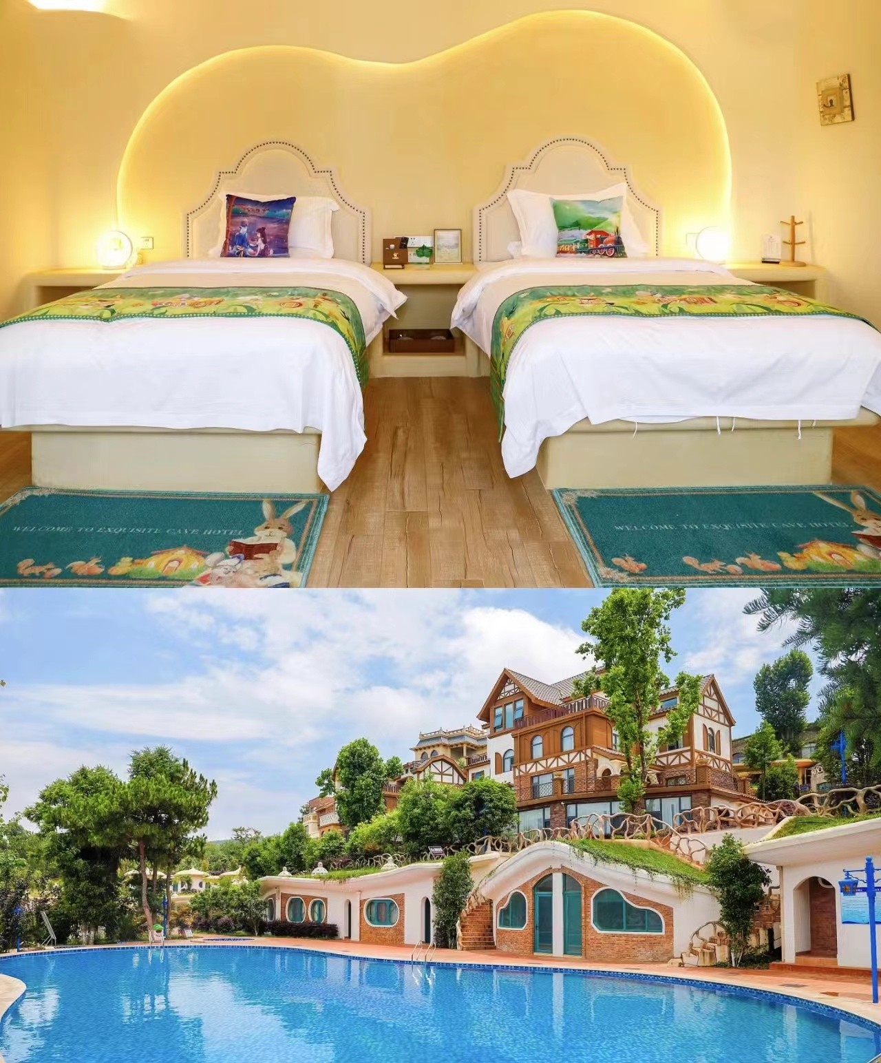 洞穴酒店:霍比特小屋风,彩色园门首尾相连,小屋嵌在山坡里,梦幻独特,配备露天游泳池