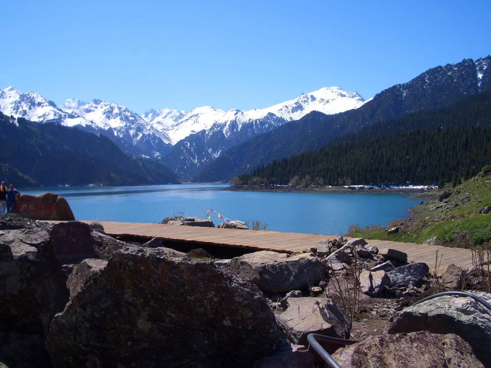 天池位于新疆阜康市境内的博格达峰下的半山腰,东距乌鲁木齐110公里,海拔1980米,是一个天然的高山湖泊。湖面呈半月形,长3400米,最宽处约1500米,面积4.9平方公里,最深处约105米。湖水清澈,晶莹如玉。四周群山环抱,绿草如茵,野花似锦。有“天山明珠”盛誉。挺拔、苍翠的云杉、塔松,漫山遍岭,遮天蔽日,十分美丽。