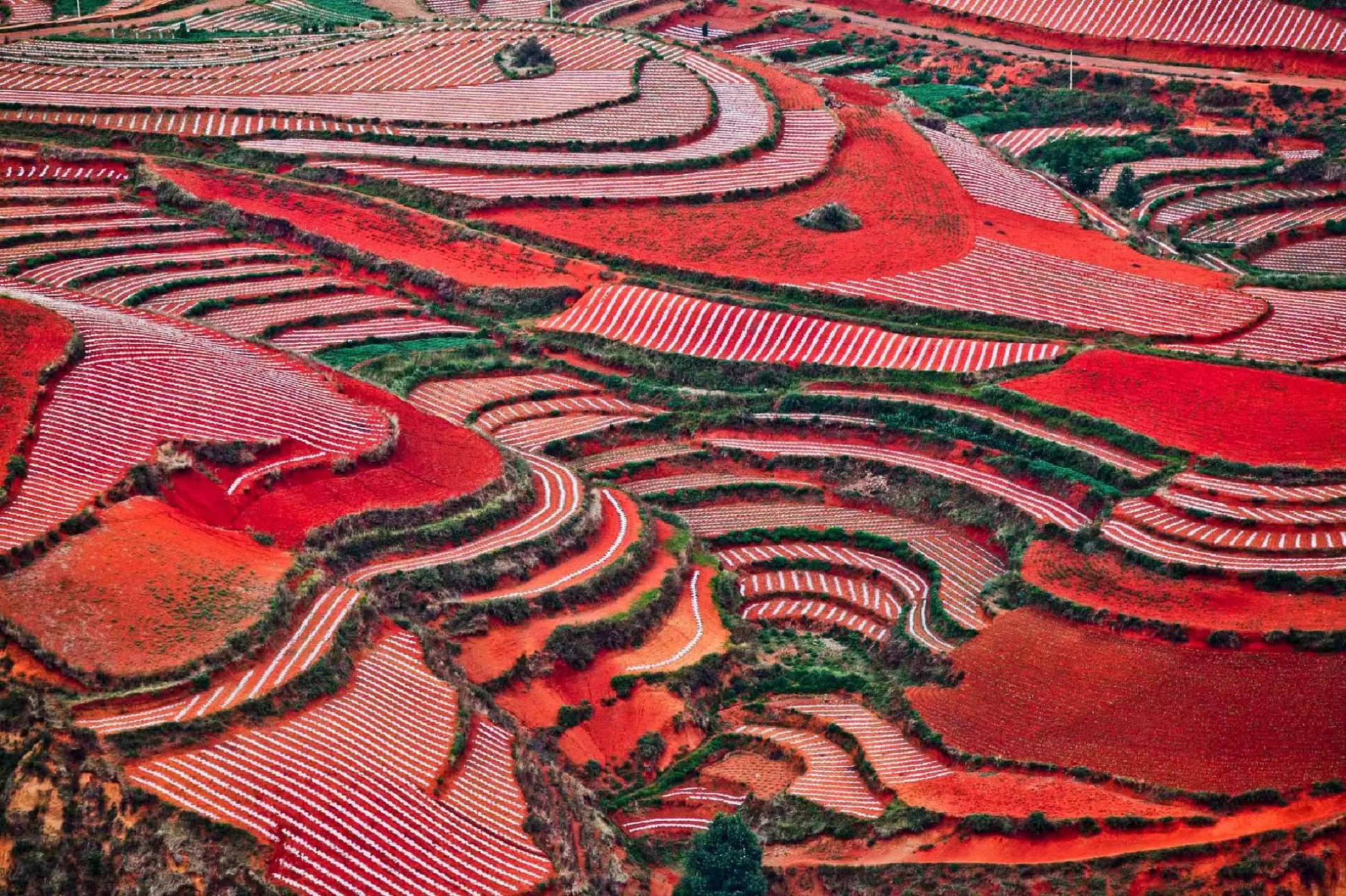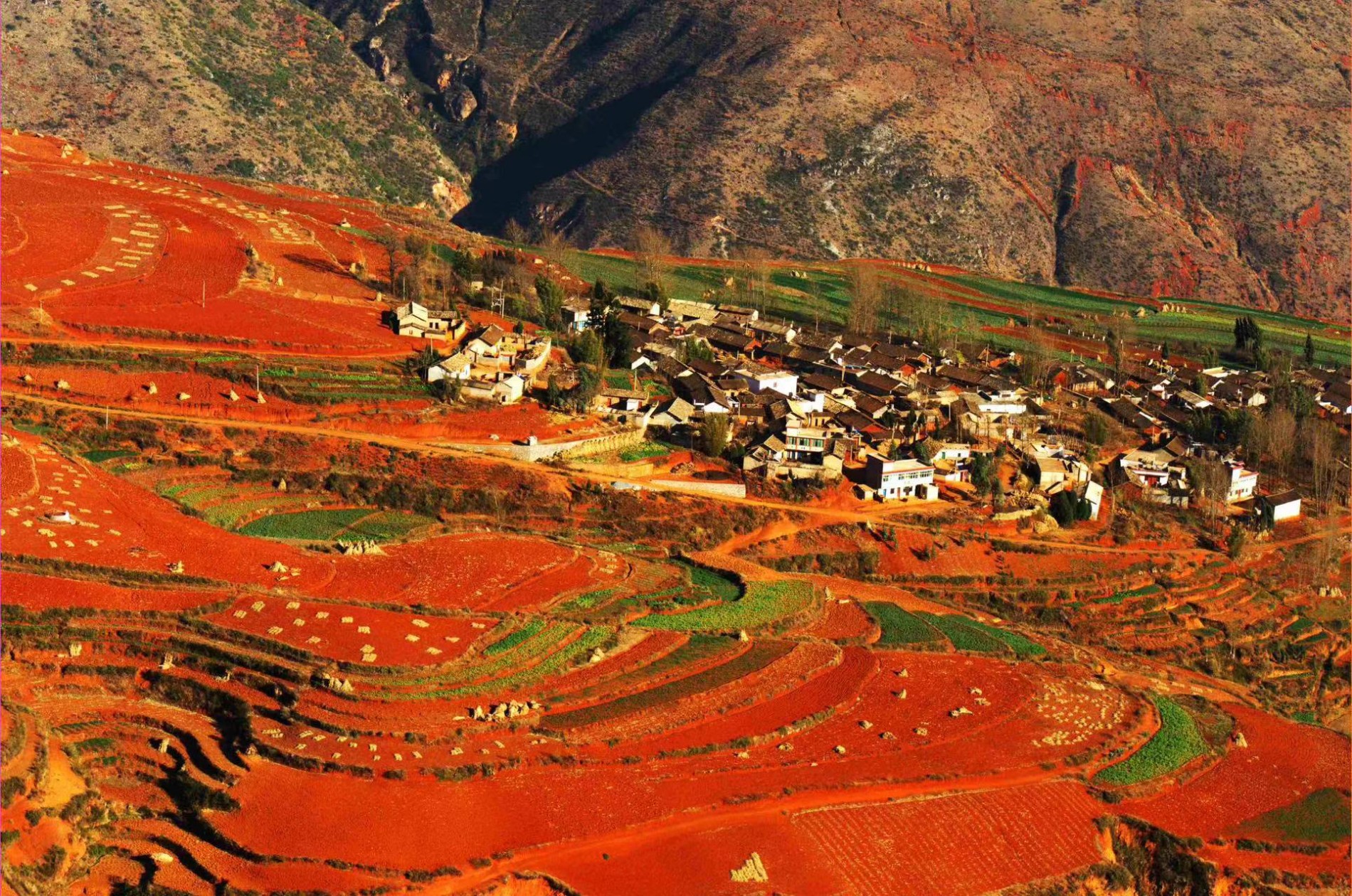 云南地处温暖湿润的环境,土壤里的铁质经过氧化慢慢沉积下来,逐渐形成了炫目的色彩。东川红土地指的是位于昆明市东川区西南40多公里的红土地镇、有一名叫“花石头”(在109公里程碑处)的地方,这里方圆近百里的区域是云南红土高原上集中、典型、具特色的红土地。每年9至12月,一部分红土地翻根待种,另一部分红土地已经种上绿绿的青稞或小麦和其他农作物,远远看去,就像上天涂抹的色块,色彩绚丽斑斓,衬以蓝天、白云和那变幻莫测的光束,构成了红土地壮观的景色。
