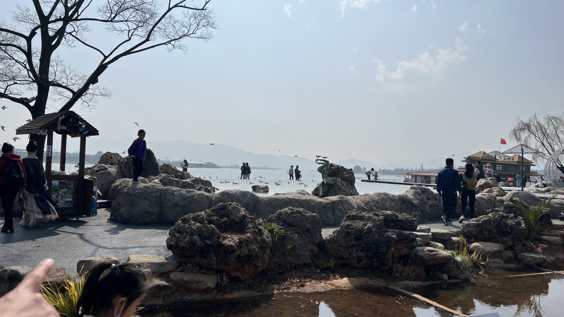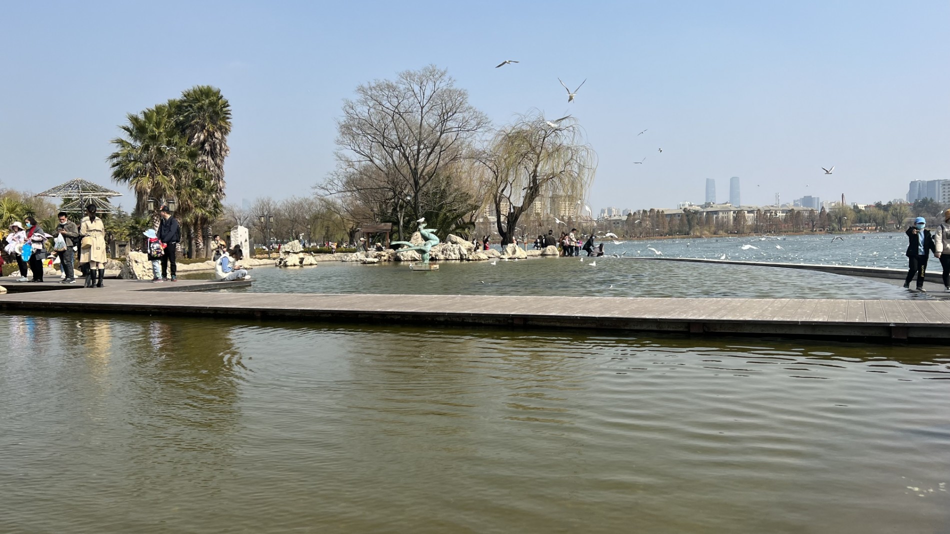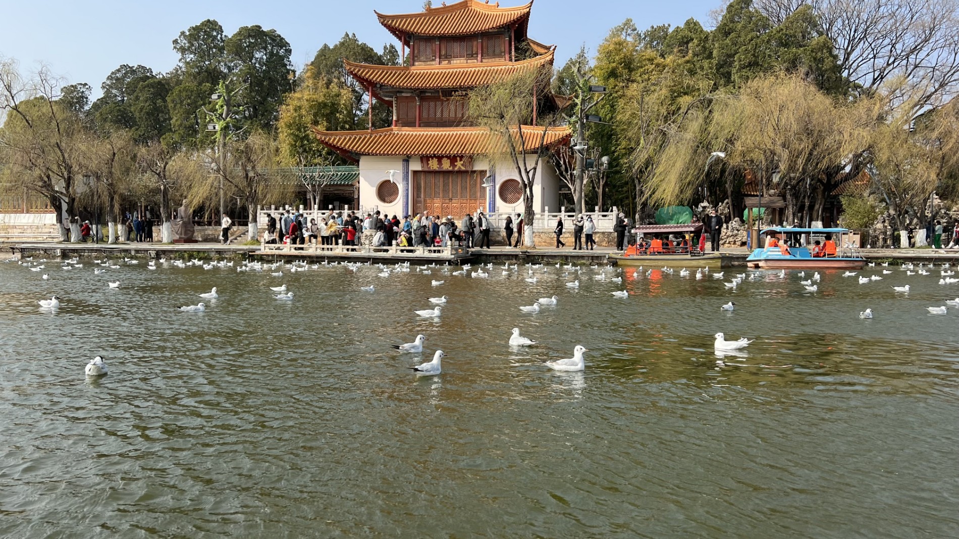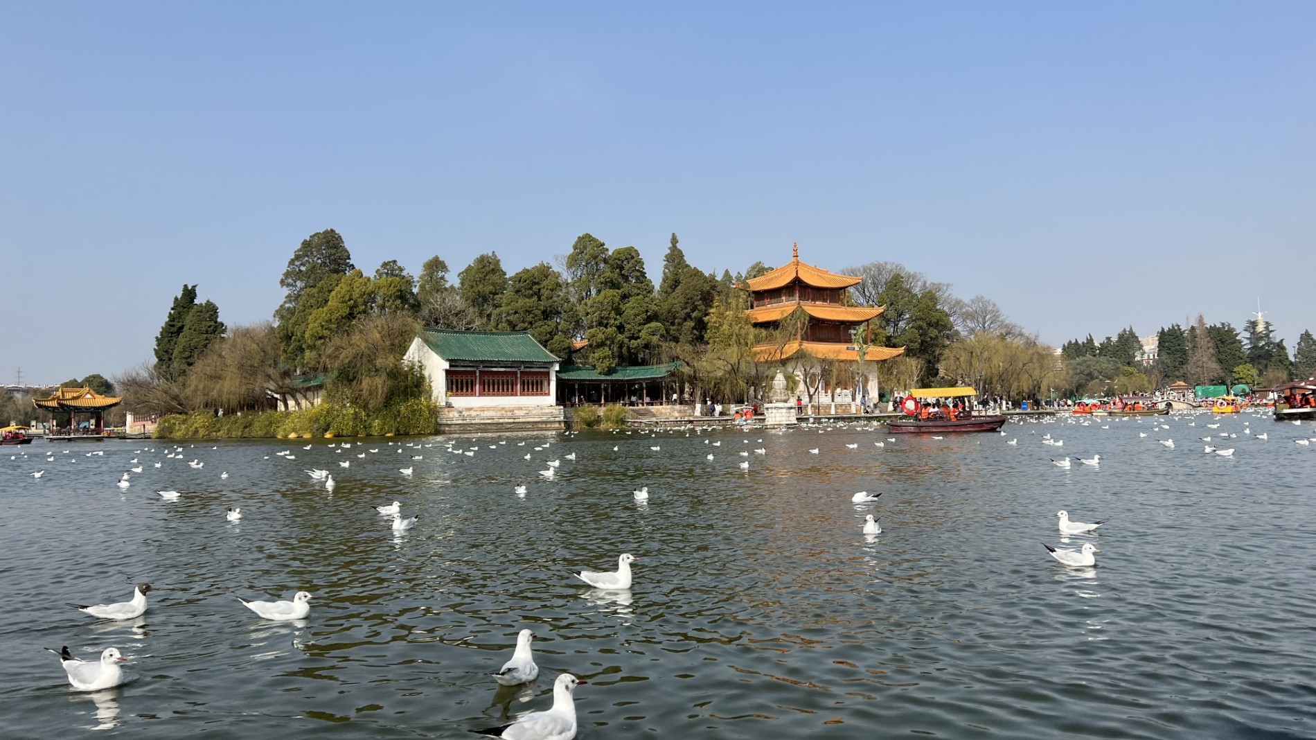 大观楼为一座三重檐攒尖顶云南传统古建筑,平面呈方形,四周设有月台,南面面水,月台周边为石灰岩方整石所砌,上墁石板,建筑西面和长廊相接。