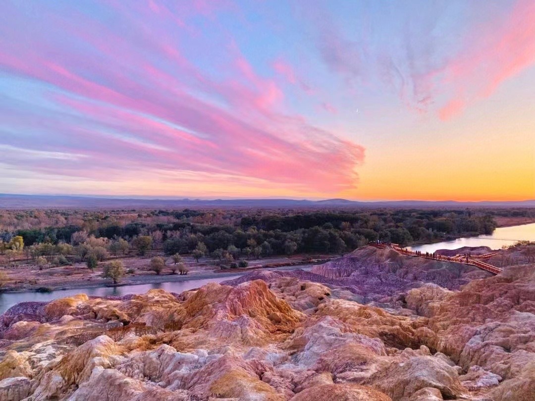 温馨提示: 1、九曲十八弯日落大约时间参考:5 月 21:00;6 月 21:30;7 月 21:30;8 月 21:00;9 月 20:30;10 月 19:30。 2、区间车抵达景区终点站,由终点站前往“九曲十八弯”的观景台有 5 公里左右的路程,有木栈道,可走路前往,需要 20 分钟左右抵达,也可做电瓶车前往,单程 10 元/人(费用不含,敬请自理),不建议骑马!
