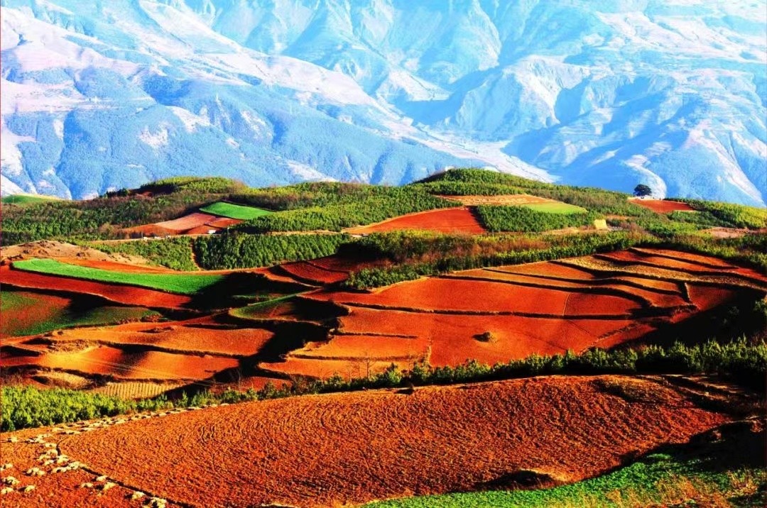 早餐后乘车至【东川红土地】行车大约3.5小时左右,下午拍摄【千年龙树】【多依树】抵达【落霞沟】拍摄日落光影效果,【瓦房梁子】拍摄日落晚霞。红土地介绍:东川红土地位于昆明市东川区、一个叫“花石头”(在109公里里程碑处)的地方,被专家认为是全世界除巴西里约热内卢外最有气势的红土地,而其景象甚至比巴西红土地更为壮美。放眼望去,山川和原野呈现出一片片暗红、紫红、砖红等不同的红色,方圆数百里大大小小的山头、山坡上,油菜花与洋芋花热烈地绽放着,金色的麦浪在清凉的山风下如碧浪般翻滚,一层绿,一层白,又一层红,一层金